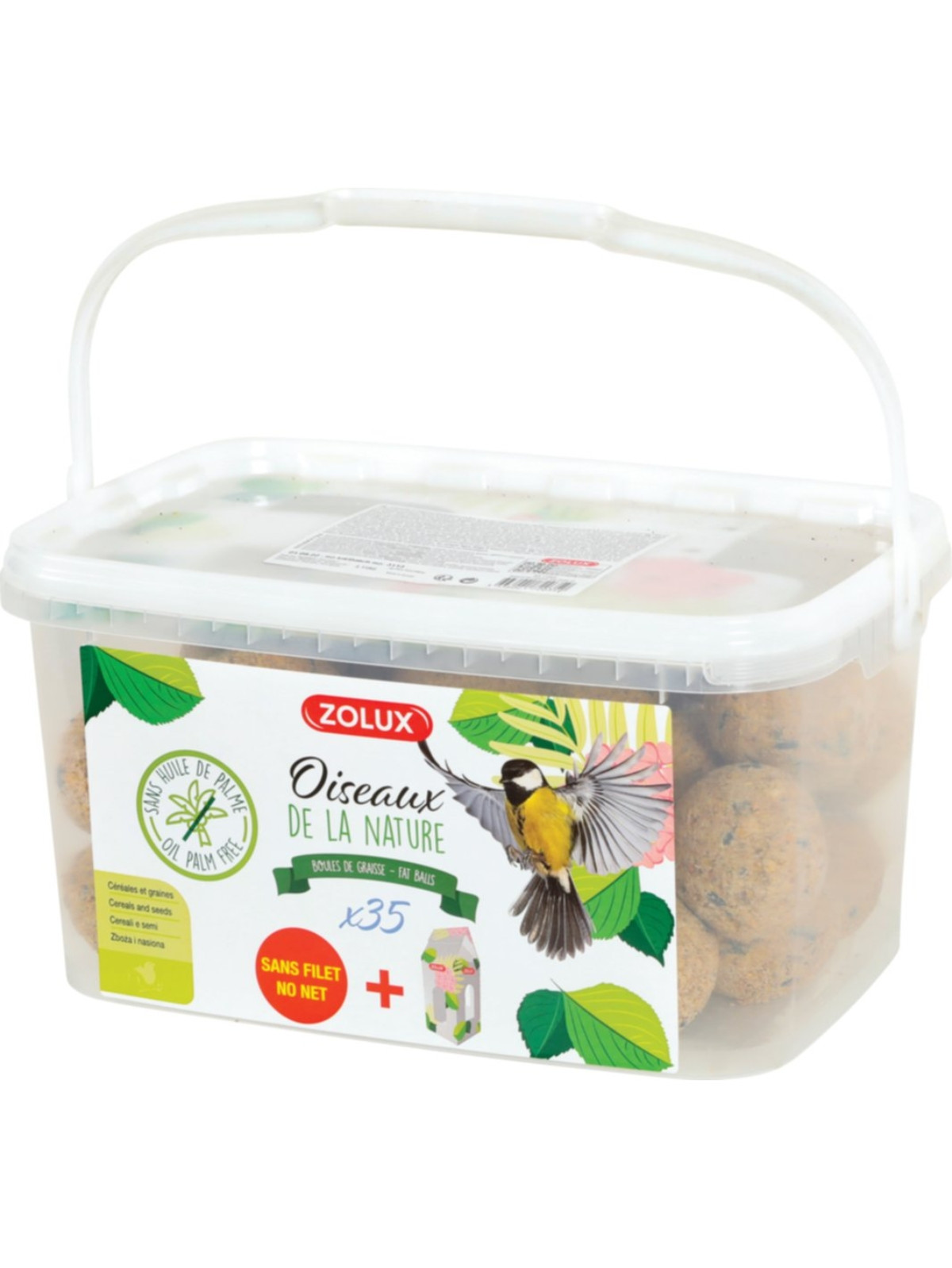 Ce produit Zolux propose un seau de 35 boules de graisse de 90 g chacune, idéal pour nourrir les oiseaux du jardin toute l’année. Conçu pour combler les besoins énergétiques des oiseaux en période froide, il contient une combinaison de céréales, graines, huiles et graisses. Facile à distribuer, il attire les oiseaux et contribue à la biodiversité locale.
