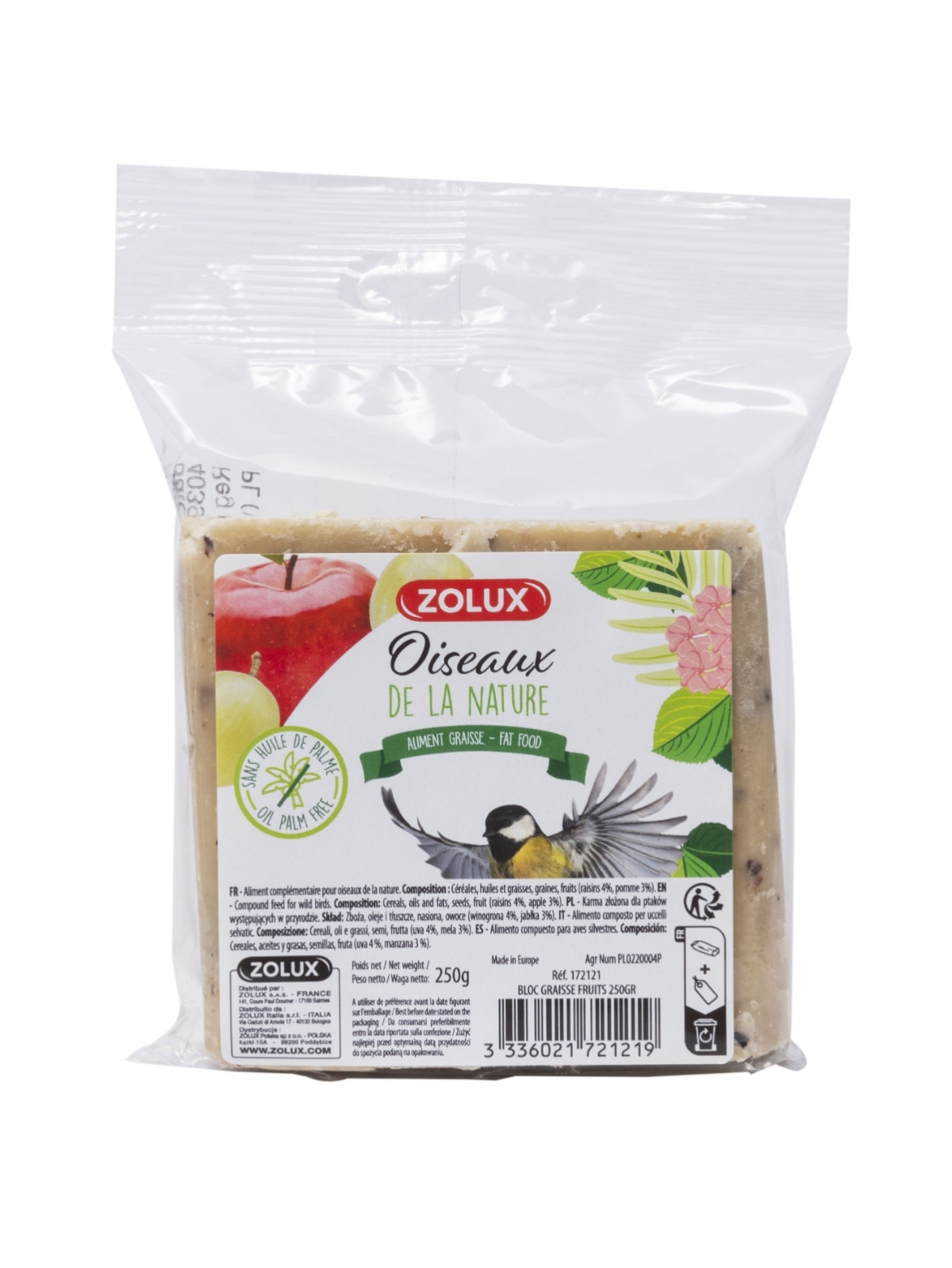 Ce bloc de graisse aux fruits de la marque Zolux est un complément alimentaire conçu pour les oiseaux sauvages de jardin. Il combine graisse végétale, graines et fruits, sans huile de palme, sans colorant ni additif chimique. Facile à suspendre ou à poser, il favorise l’apport calorique et les fibres essentielles au bon transit des oiseaux, notamment en période froide.